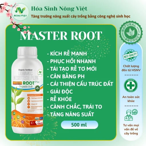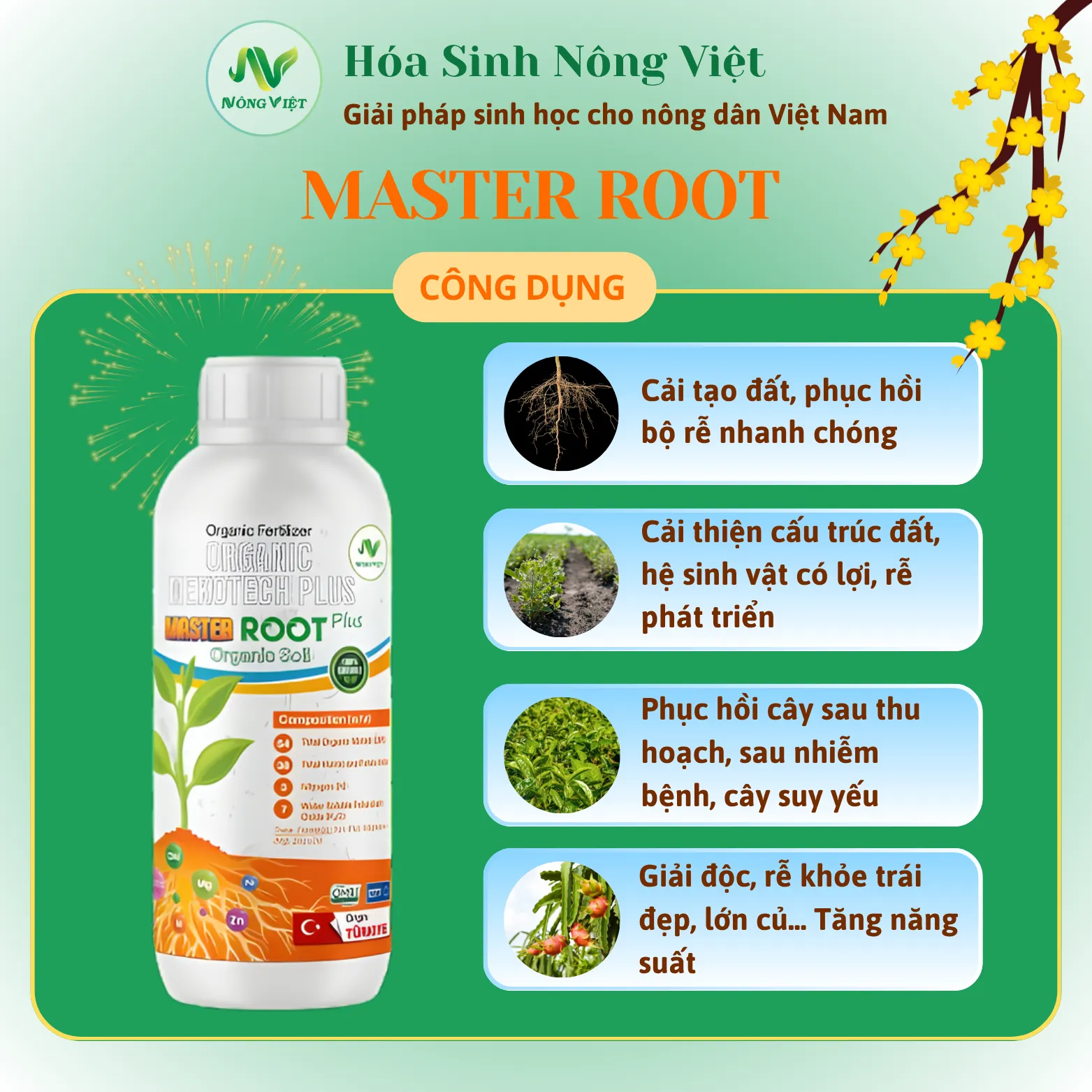 MASTER ROOT PLUS là phân bón hữu cơ cao cấp, chuyên dùng để kích thích ra rễ mạnh, phục hồi nhanh cây trồng sau stress như ngập úng, hạn, cấy ghép, suy rễ hoặc sau khi sử dụng thuốc bảo vệ thực vật. Sản phẩm giúp hình thành nhiều rễ tơ, rễ trắng khỏe, từ đó tăng khả năng hấp thu dinh dưỡng. Giúp cây sinh trưởng ổn định, bật đọt nhanh và phát triển bền vững.