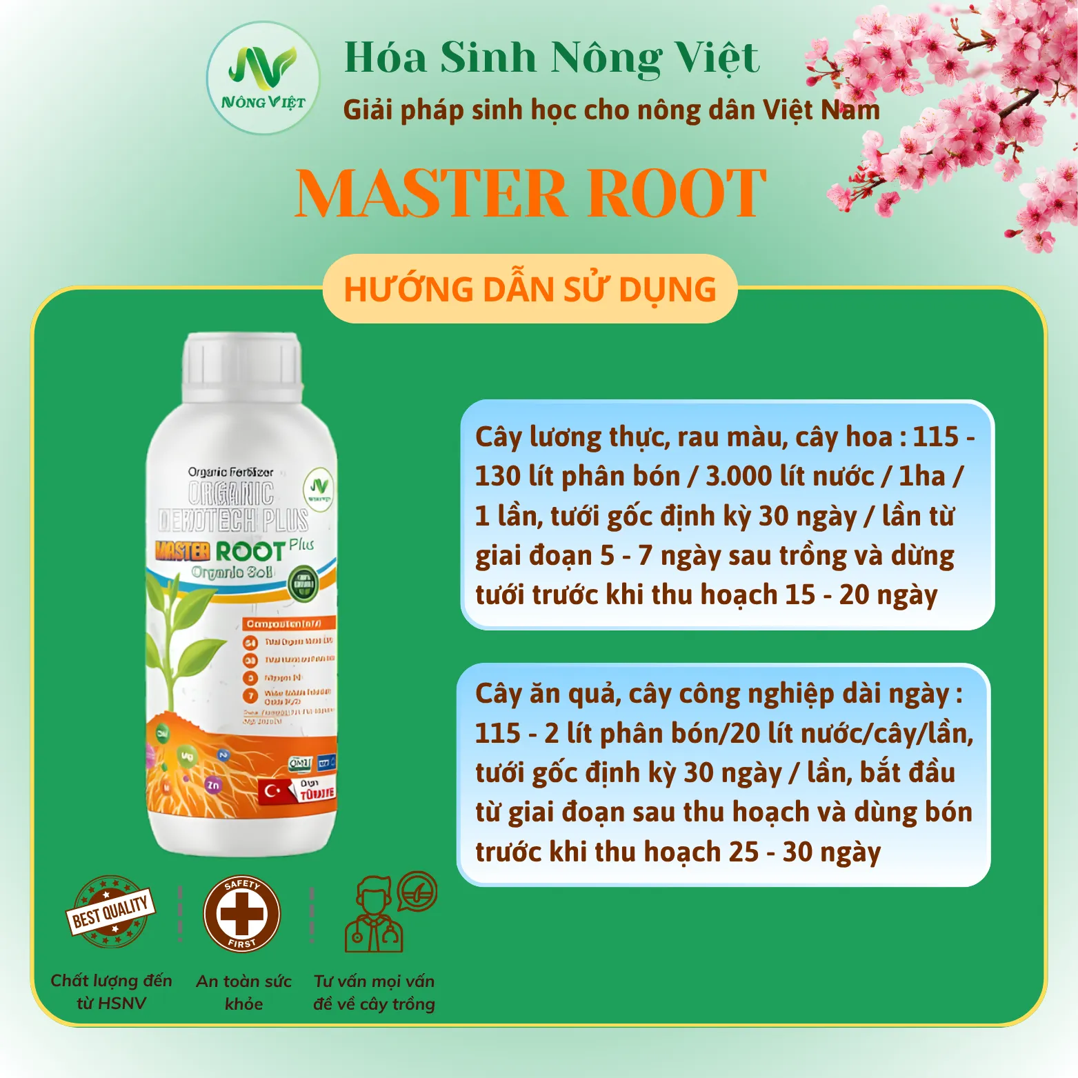 Pha 10–20ml MASTER ROOT PLUS cho 16 lít nước, tưới trực tiếp vào gốc hoặc phun đều vùng rễ. Sử dụng định kỳ 7–10 ngày/lần.