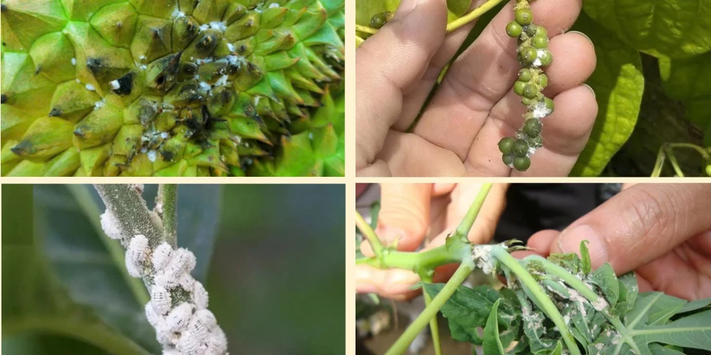 Ngoài ra, nhiều loại côn trùng còn hút nhựa cây khiến lá cây biến dạng, cây sinh trưởng kém và dễ rụng hoa hoặc trái non. Trên thân cây đôi khi có thể thấy các vết đục hoặc đường hầm do sâu gây ra.